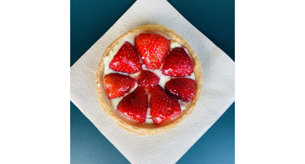 Fraises, crème madame (Lait, sucre, œuf, farine, beurre, vanille, gelatine de poisson), Pâte brisée (Farine, végétaline, eau, sucre)